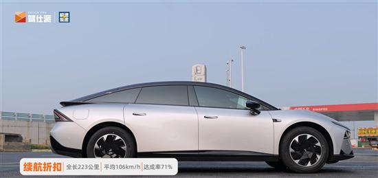 经过2小时10分钟的行驶,小鹏P7+到回了出发时的服务区,此时电量剩余44% SOC,表显续航272 km,全程掉电314 km,实际行驶223km,高速续航折扣率(达成率)为71%。
