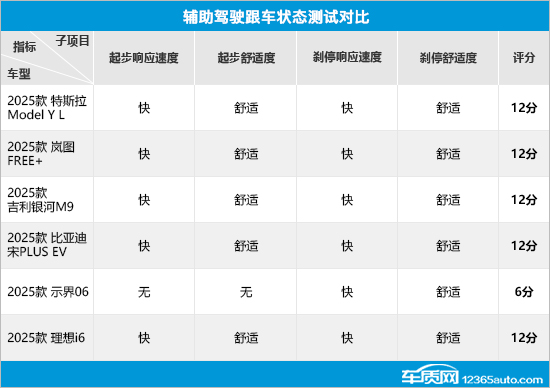 在辅助驾驶跟车状态测试对比中,除示界06外,其余车型均获得满分,起步和刹停过程中的响应速度和舒适度都能令人满意。示界06由于不支持自动跟车起步功能,因此在起步响应速度和起步舒适度两项未获得分数。