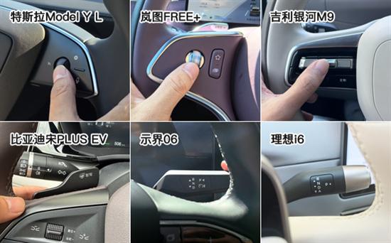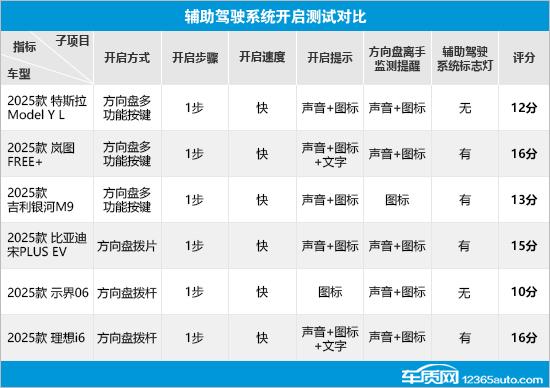 在辅助驾驶系统开启测试对比中,2025款示界06(以下简称:示界06)和2025款理想i6(以下简称:理想i6)采用方向盘拨杆开启,2025款比亚迪宋PLUS EV(以下简称:比亚迪宋PLUS EV)采用方向盘拨片开启,其余车型采用方向盘多功能按键开启。开启步骤方面,6款车型均只需1步,并且开启速度快,日常使用十分便捷。开启提示方面,2025款岚图FREE+(以下简称:岚图FREE+)和理想i6均提供三种提示方式,示界06仅提供一种提示方式,其余车型提供两种提示方式。此外,6款车型均配备方向盘离手监测提醒功能,除2025款吉利银河M9(以下简称:吉利银河M9)仅支持图标提醒外,其余车型都具备两种提醒方式。值得一提的是,岚图FREE+、吉利银河M9、比亚迪宋PLUS EV和理想i6还配备了辅助驾驶系统标志灯,能够为其他道路参与者提供明显提示。