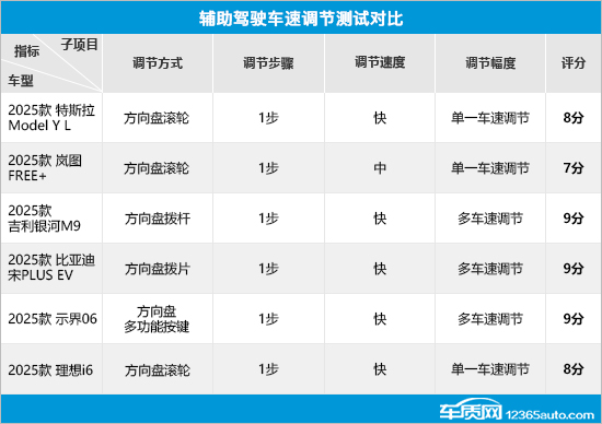 在辅助驾驶车速调节测试对比中,6款车型的整体表现基本符合预期。虽然调节方式存在差异,但在调节步骤方面均表现一致。需要指出的是,岚图FREE+调节速度略慢于其他车型。而在调节幅度方面,2025款特斯拉Model Y L(以下简称:特斯拉Model Y L)、岚图FREE+和理想i6不支持多车速调节,因此出现失分情况。