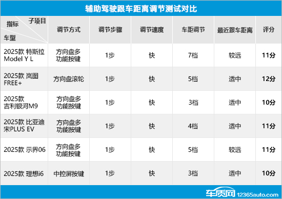 在辅助驾驶跟车距离调节测试对比中,岚图FREE+以满分成绩领跑,其不仅支持5档车距调节,并且最近跟车距离适中,整体表现出色。特斯拉Model Y L和示界06分别支持7档和5档车距调节,不过最近跟车距离较远,导致失分。相比之下,吉利银河M9和理想i6表现相对较差,只支持3档车距调节,在该项测试中排名靠后。