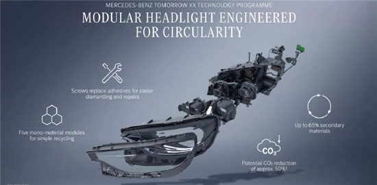 梅赛德斯正在通过可修复的大灯和再生材料重新思考制造业,以减少排放和浪费。为了降低维修车辆时替换零件的碳排放和维修成本,奔驰正研发方便维修的的大灯。用螺丝固定关键部位如大灯外壳而不是之前用的胶水粘接,并可单独替换LED发光单元。另外,门板等内饰覆盖件也采用了更多的可回收材料,降低碳排放,以满足欧盟新规:2035年起实现减排90%。