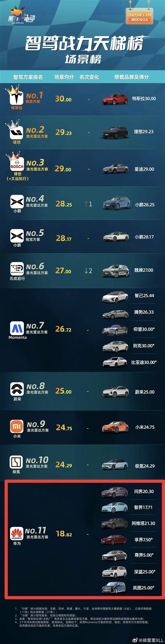 媒体“智驾战力天梯榜” 华为系倒数第一