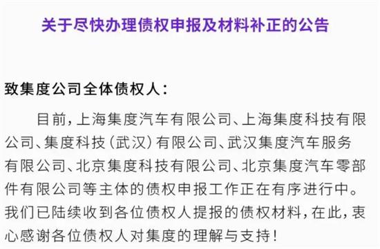 目前,上海集度汽车有限公司、上海集度科技有限公司、集度科技(武汉)有限公司、武汉集度汽车服务有限公司、北京集度科技有限公司、北京集度汽车零部件有限公司等主体的债权申报工作正在有序进行中。