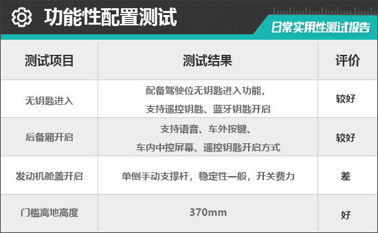 评测车的后备厢支持语音、车外按键、车内中控屏幕、遥控钥匙多种开启方式,操作简单方便,确保了实用性。