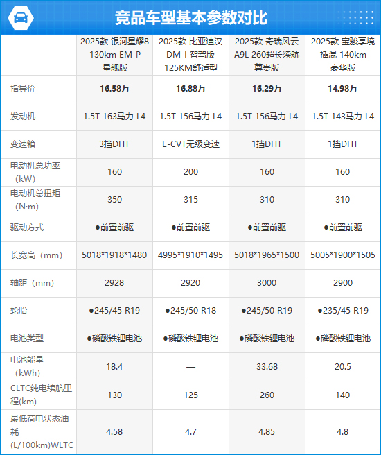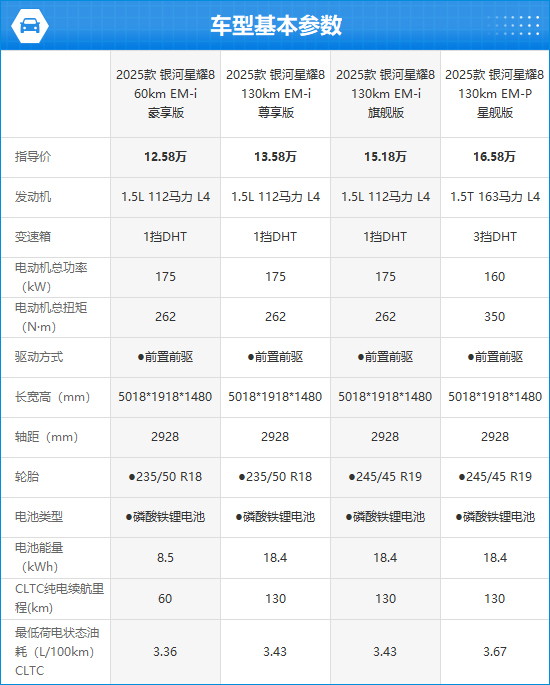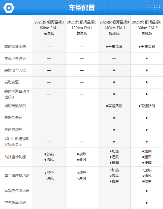 2025款吉利银河星耀8提供EM-i和EM-P两套雷神超级电混系统。其中,EM-i车型电池能量分为8.5kWh和18.4kWh两种,对应CLTC纯电续航里程分别为60km和130km;EM-P车型CLTC纯电续航里程均为130km。全系车型在主被动安全、灯光系统、车机以及智能化等配置方面差异不大,主要区别在于辅助驾驶功能和舒适性配置。除60km EM-i 豪享版和130km EM-i 尊享版外,其余车型均搭载千里浩瀚辅助驾驶系统,支持高速领航辅助功能。两种动力版本的顶配车型独享前排和后排座椅按摩、方向盘加热等配置。