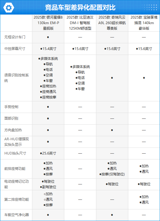 与比亚迪汉DM-i、奇瑞风云A9L和宝骏享境三款插混中大型车进行对比,此次选取的2025款吉利银河星耀8 EM-P在发动机最大功率和最大扭矩等方面稍占优势。而在车机智能化方面,2025款吉利银河星耀8 EM-P不仅独享手势控制和面部识别,还支持更多的语音识别控制功能,并且搭载了25.6英寸AR-HUD增强现实抬头显示系统,提供更出色的人机交互体验。