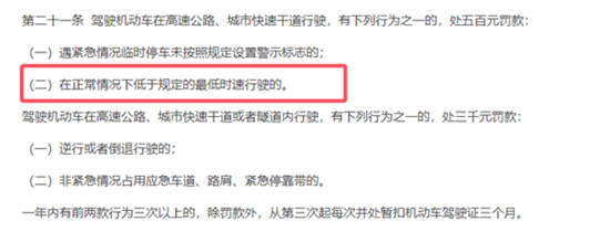 交警的判罚有据可循,《深圳经济特区道路交通安全违法行为处罚条例》第二十一条明确规定,驾驶机动车在高速公路、城市快速干道行驶,正常情况下低于规定的最低时速行驶的,处五百元罚款;一年内有上述行为三次以上的,除罚款外,从第三次起每次并处暂扣机动车驾驶证三个月。