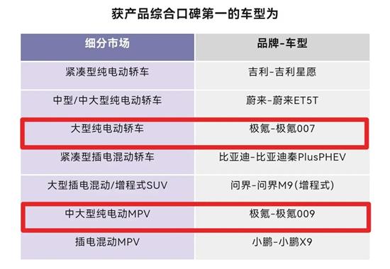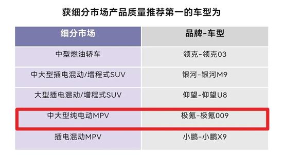 近日,国际汽车质量标准化协会(IAQSA?)联合中国汽车推荐度研究工作组,首次发布中国汽车推荐度研究(NPS)结果,极氪品牌两款车型在多维度严选中表现突出,夺得多个细分市场榜首:极氪009荣获“中大型纯电动MPV”产品质量推荐第一和产品综合口碑第一两项荣誉,极氪007在“大型纯电动轿车”市场斩获产品综合口碑第一。