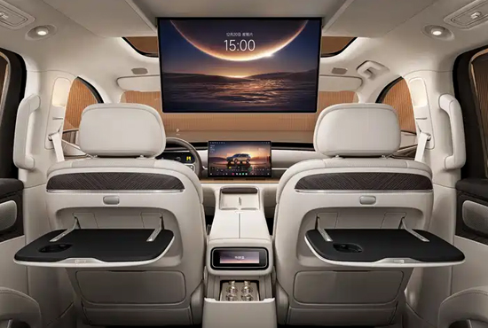 第二排座椅前方还配备21.4英寸3K电动娱乐屏和6英寸多功能控制屏,以及车载冰箱,娱乐体验感和日常实用性出众。