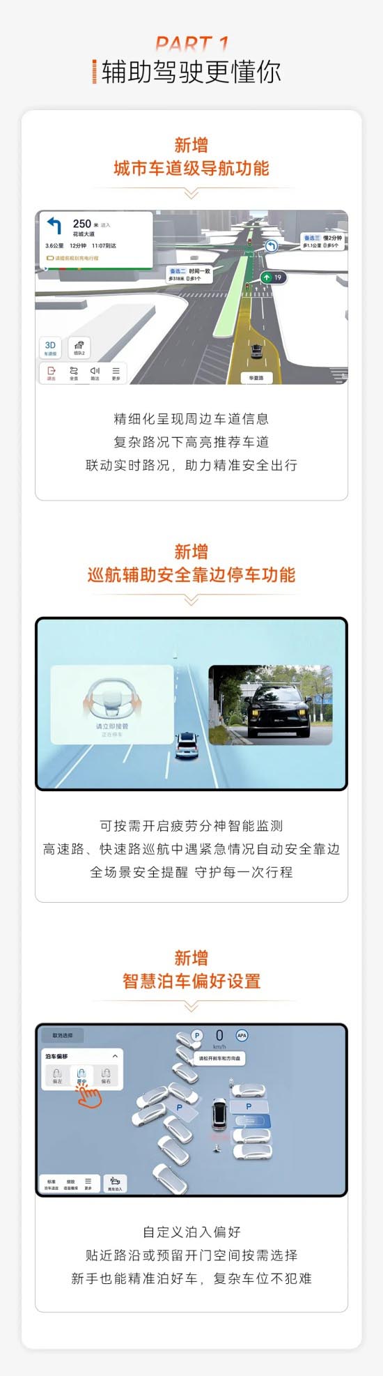 城市车道级导航功能、巡航辅助安全靠边停车功能、智慧泊车偏好设置;