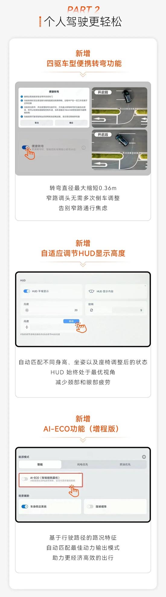 四驱车型便携转弯功能、自适应调节HUD显示亮度、IA-ECO功能(增程版);