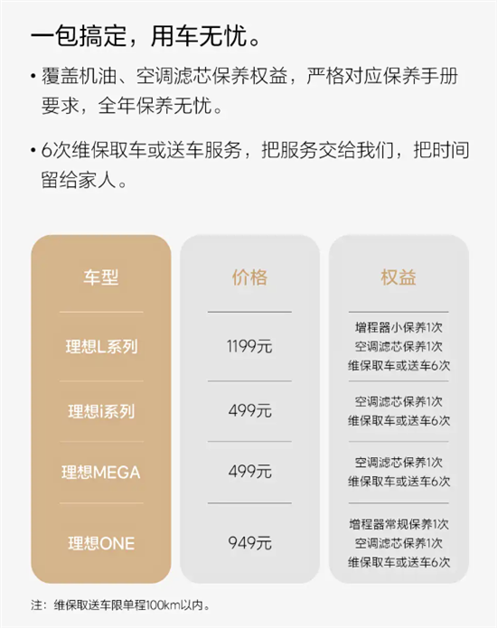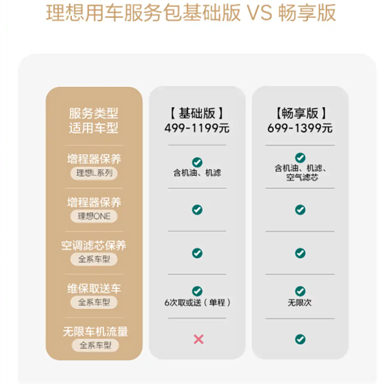 近日,理想汽车官方宣布推出用车服务包-基础版,权益覆盖机油保养、空调滤芯更换及维保取送车等核心用车需求,理想L系列、i系列、MEGA及理想ONE全系车型均支持适配,价格区间为499元-1199元,精准满足不同车型车主的刚需养护需求。