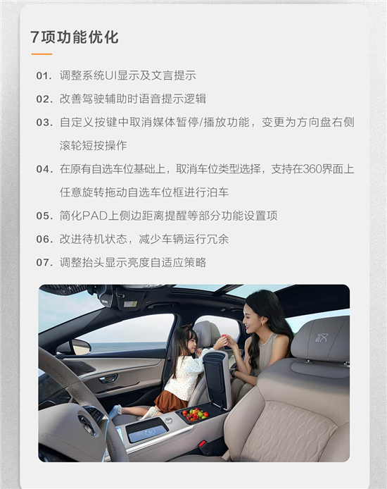 功能优化部分,新车升级后将调整系统UI显示及文言提示、改善驾驶辅助时语音提示逻辑、自定义按键功能调整、支持在360界面上任意旋转拖动自选车位框进行泊车、简化PAD上侧边距离提醒等部分功能设置项、改进待机状态、调整抬头显示亮度自适应策略等。有关新车的更多信息,车质网将持续关注及报道。