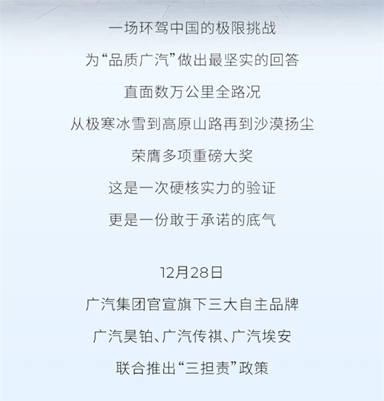 广汽集团日前官宣旗下三大自主品牌广汽昊铂、广汽传祺、广汽埃安,联合推出“三担责”政策。