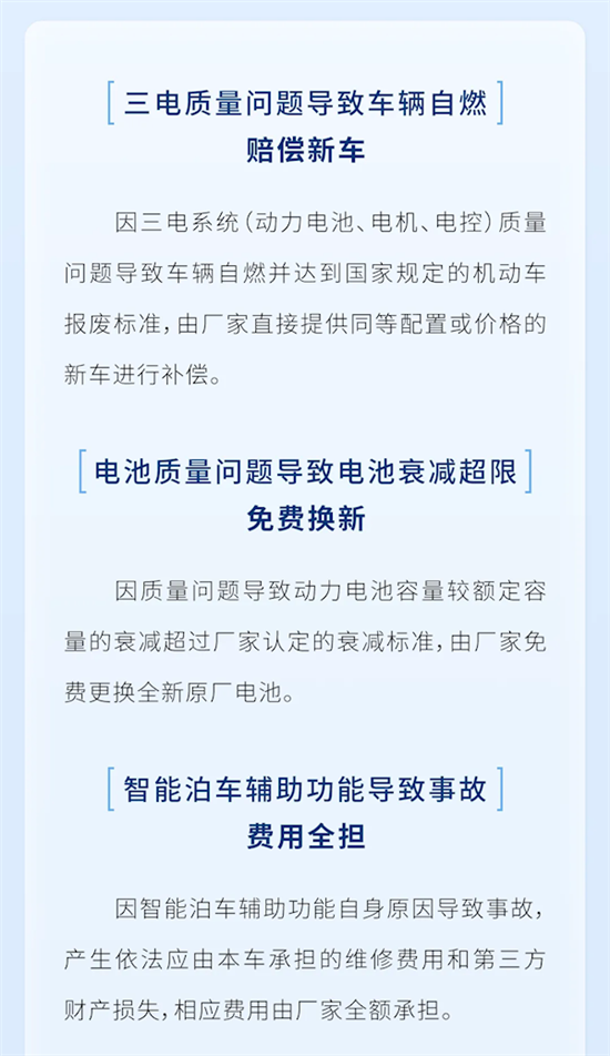 因三电系统(动力电池、电机、电控)质量问题导致车辆自燃并达到国家规定的机动车报废标准,由厂家直接提供同等配置或价格的新车进行补偿。