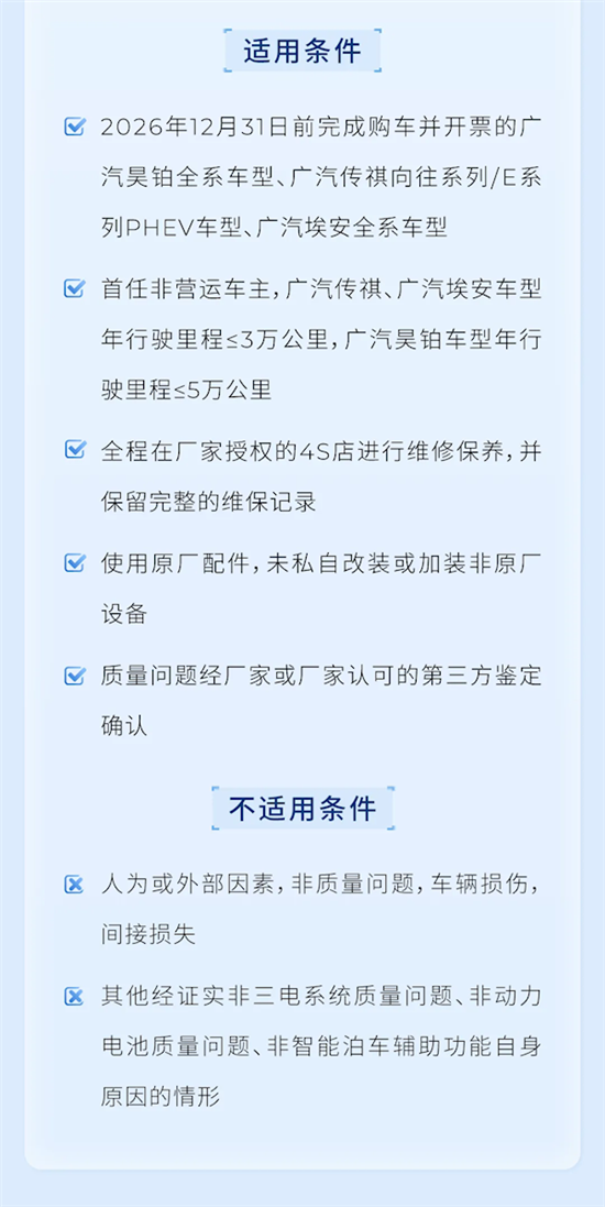 适用车型涵盖2026年12月31日前完成购车并开票的广汽昊铂全系车型、广汽传祺向往系列/E系列PHEV车型、广汽埃安全系车型的首任非营运车主。