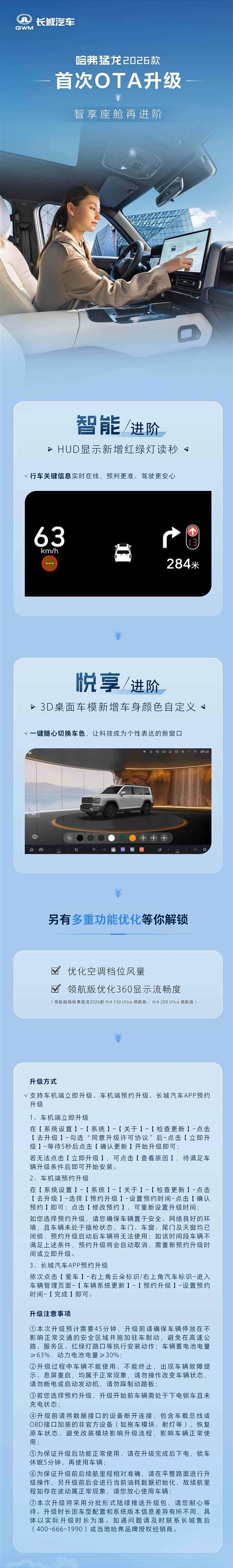 近日,长城汽车官方宣布,2026款哈弗猛龙正式迎来首次OTA升级,并开启分批推送。据悉,本次升级将针对智能座舱进行优化,新增和改进多项功能,使用体验更佳。 详细来看,本次升级新增HUD显示红绿灯读秒功能,3D桌面车模新增车身颜色自定义。同时,车辆还针对空调档位风量以及领航版360显示流畅度等进行了优化。有关新车的更多信息,车质网将持续关注及报道。 责任编辑:枯川 10 网友评论 您需要登录后才可以评论,登录| 注册 用户登录 用户名 密码 下次自动登录 忘记密码 没有账号 马上注册 使用第三方账号登录 QQ账户 新浪微博 腾讯微博 绑定手机 手机号码 验 证 码