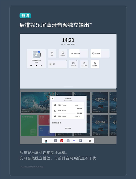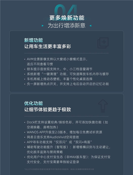 详细来看,本次升级将新增无感充电、东风投屏、悬浮歌词、后排娱乐屏App遥控器和后排娱乐屏蓝牙音频独立输出等功能。同时,系统还优化了哨兵模式体验、360全景影像(AVM)全链增强等。