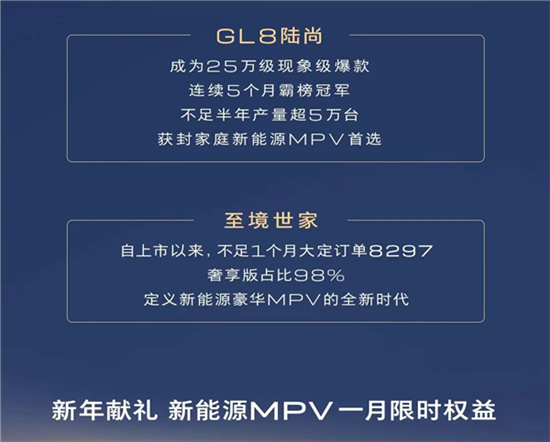 GL8陆尚成为25万级现象级爆款,连续5个月霸榜冠军,不足半年产量超5万台,获封家庭新能源MPV首选。