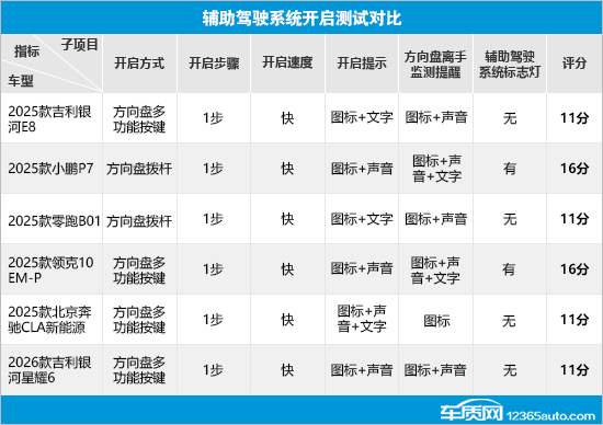在辅助驾驶系统开启测试对比中,2025款小鹏P7(以下简称:小鹏P7)和2025款零跑B01(以下简称:零跑B01)采用方向盘拨杆开启,其余车型均采用方向盘多功能按键开启。开启步骤方面,6款车型均只需1步,并且开启速度快,日常使用便捷。开启提示方面,仅2025款北京奔驰CLA新能源(以下简称:奔驰CLA新能源)提供三种提示方式,其余车型均为两种提示方式。此外,6款车型均配备方向盘离手监测提醒功能,除奔驰CLA新能源仅支持图标提醒外,其余车型都具备两种及以上提醒方式。值得一提的是,小鹏P7和2025款领克10 EM-P(以下简称:领克10 EM-P)还配备了辅助驾驶系统标志灯,能够为其他道路参与者提供明显提示。