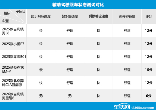 在辅助驾驶跟车状态测试对比中,除领克10 EM-P和银河星耀6以外,其余车型均获得满分,起步和刹停过程中的响应速度和舒适度都能令人满意。其中,领克10 EM-P的失分原因在于起步阶段响应速度较慢,而银河星耀6则由于不支持自动跟车起步功能,因此在起步响应速度和起步舒适度两项未获得分数。