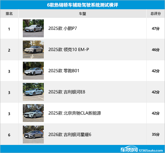 通过此次横评可以发现,小鹏P7凭借辅助驾驶系统开启测试中的出色表现,结合多项测试中的满分成绩,总评分达到47分,排名第一;领克10 EM-P表现同样可圈可点,以46分的成绩紧随其后;零跑B01、银河E8和北京奔驰CLA新能源虽然分别在不同测试环节存在丢分情况,不过最终评分也都达到40分以上,成绩基本令人满意。至于银河星耀6,由于在跟车状态测试中存在明显减分情况,导致其最终评分为35分,排名垫底。当然,参与横评的6款车型在辅助驾驶系统测试中或多或少都存在一些问题,希望厂家在后续的车型升级中持续优化改进,为车主带来更加安全便捷的辅助驾驶体验。