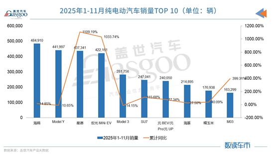 根据盖世汽车产业大数据平台统计,2025年1-11月纯电市场累计销量突破869万辆,整体保持增长。在规模扩大的同时,内部结构也在发生深刻调整:经济型代步车与中高端智能车双轮驱动,传统品牌与新势力同台竞技,产品定位与价格带进一步细分,这些趋势在销量前十车型中清晰可见。