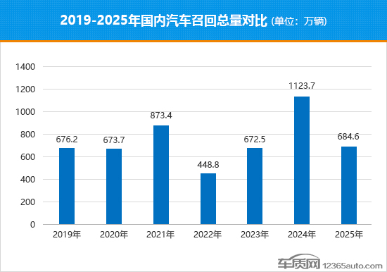 2025年是中国新能源汽车市场实现历史性突破的关键一年,在“以旧换新”政策强力推动,叠加技术迭代加速、消费需求升级等多重利好因素,汽车行业实现爆发式增长。与之形成反差的是,国内汽车召回次数和召回总量却较2024年出现明显下降,但仍处于近四年以来的次高位水平。从2019年至2025年国内汽车召回总量的对比数据来看,除2022年召回总量处于相对低位外,2021年与2024年的召回总量均迎来同比大幅攀升,而2025年的召回总量则回落至与2023年大体持平的水平。