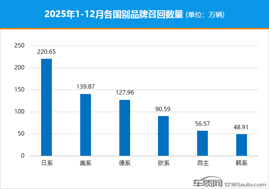 从各国别召回情况来看,德系品牌在召回次数上虽然依旧处于领先地位,不过其召回总量只有1,279,618辆,相比2024年降幅达到68.4%,位居第三。日系品牌在经历2024年相对低迷的表现后,召回总量重回榜首,全年共计召回2,206,507辆,同比上涨27.3%,占比超过2025年召回总量的三成。