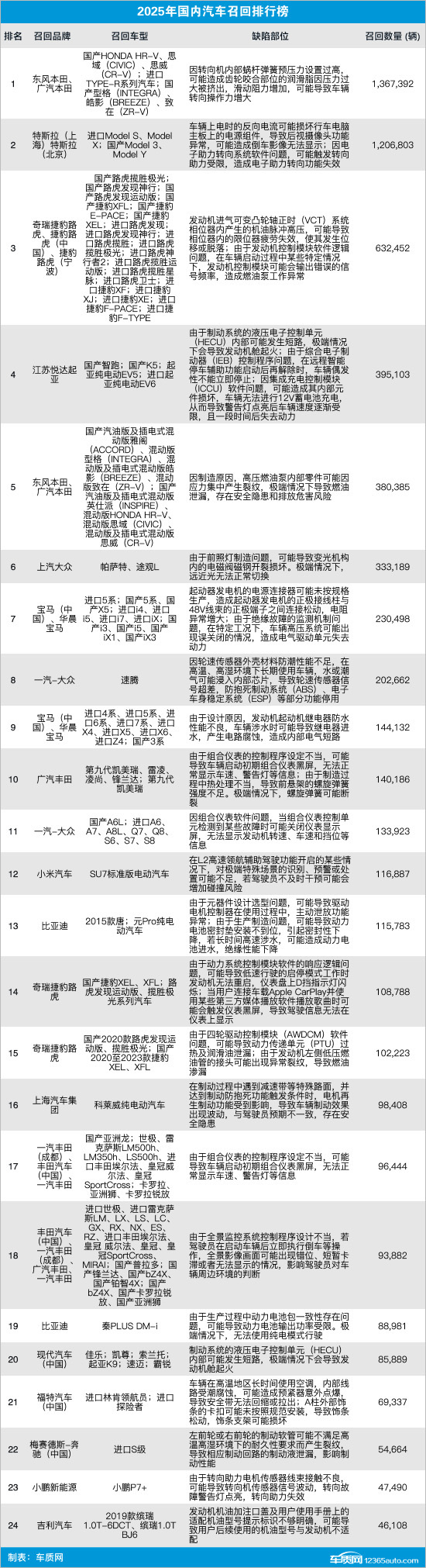 2025年国内汽车召回排行及热点回顾