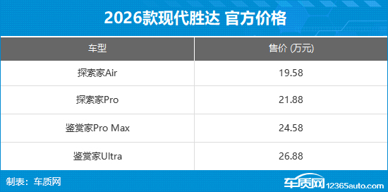 日前,2026款现代胜达正式上市,新车共推出4款车型,售价区间为19.58-26.88万元。此次改款取消了原售价23.58万元的鉴赏家Pro车型,其余车型售价保持不变,同时在配置上进行了针对性升级,进一步提升产品力。