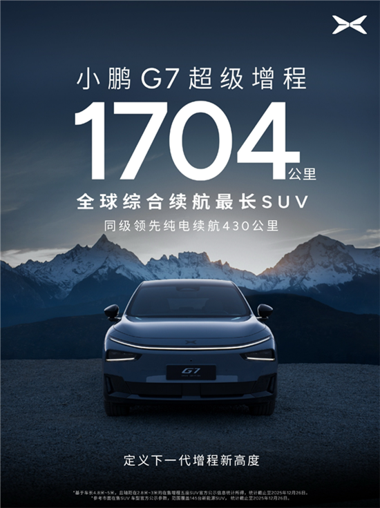 小鹏汽车将在广州举办2026全球新品发布会,正式推出四款全新车型:2026款小鹏P7+、小鹏G7超级增程、以及焕“芯”升级的2026款小鹏G6和小鹏G9。其中,小鹏G7增程版的综合续航可达1704公里,是目前全球续航最长的SUV,即便在零下20摄氏度的极寒环境下,实测续航也能达到1108.3公里。