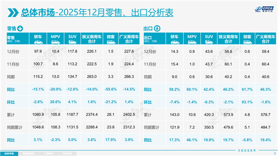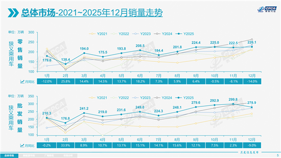 2026年1月9日,乘联分会发布的2025年乘用车市场数据,为“十四五”收官之年的中国车市画上了句点。数据显示,2025年全国乘用车市场全年累计零售2374.4万辆,同比增长3.8%,在全球经济波动、政策调整叠加消费心态变化的复杂环境中,实现了难能可贵的稳步增长。而12月作为全年收官月,市场呈现出特殊的分化态势:零售226.1万辆,同比下降14%,环比仅增长1.6%,与往年年末“抢购潮”形成鲜明反差。