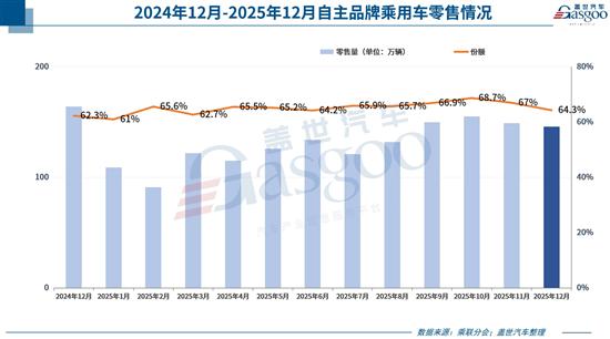 乘联分会数据显示,2025年1-12月,自主品牌累计零售市场份额高达65%,较2024年同期增长4.8个百分点。即便是在12月整体市场承压的背景下,自主品牌国内零售份额仍达到64.3%,同比增长2.2个百分点,展现出极强的市场韧性。这一数据意味着,中国乘用车市场每卖出10辆车,就有6.5辆来自自主品牌,这一占比不仅创下历史新高,更标志着市场格局从“合资主导”彻底转向“自主引领”。