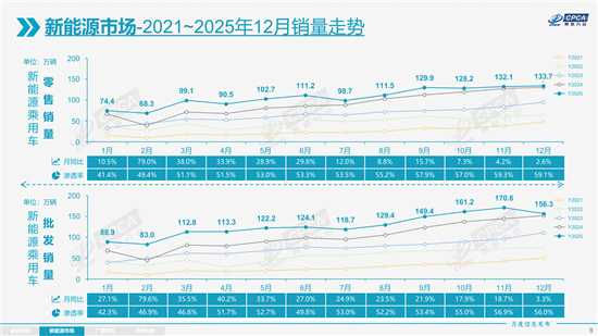 如果说自主品牌的崛起是2025年车市的“主旋律”,那么新能源市场的持续爆发则是“核心引擎”。乘联分会数据显示,2025年1-12月,新能源乘用车市场累计零售1280.9万辆,同比增长17.6%,占全年乘用车零售总量的53.9%。其中12月单月零售133.7万辆,同比增长2.6%,环比增长1.2%,在政策调整与市场观望的双重压力下,依然保持了强劲的增长势头。