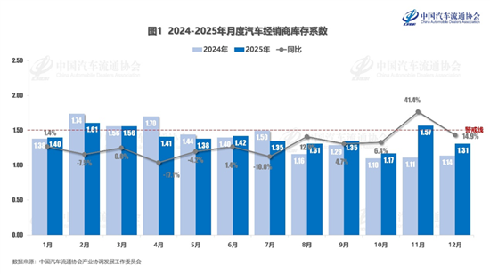 2026年1月13日,中国汽车流通协会发布数据显示,2025年12月汽车经销商综合库存系数为1.31,环比下降16.6%,同比上升14.9%,库存水平处于警戒线以下,但高于合理区间。以当月乘用车终端销量226.1万辆测算,12月末经销商库存总量约为300万辆。