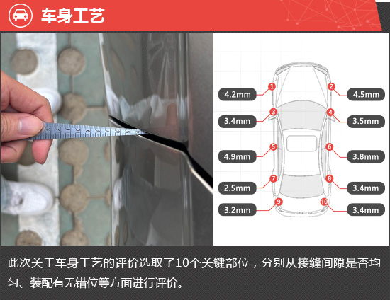 在车身工艺测试环节,整车共选取10个关键部位,每个关键部位都会选取3个关键点进行测量,以评价各关键部位缝隙的均匀程度。从测试结果来看,左侧前后车门之间的缝隙均值偏大,且与右侧前后车门之间的缝隙均值相差较大。另外,后车门至后翼子板缝隙均值同样出现左右差值较大的情况,对于测试结果造成一定影响。