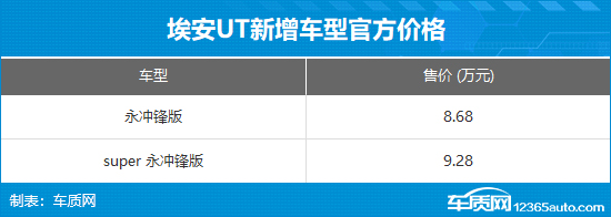 埃安UT新增永冲锋版、super 永冲锋版两款车型,8.68万起售且支持电池租用方案,还有球迷专属优惠与冠军车衣设计,为消费者带来更多高性价比纯电选择。