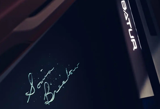 打开车门,迎宾踏板处展示了可发光的Batur标识。在此基础上,更具个性元素的定制内容还是迎宾光幕,其通过415800个微棱镜投射出车主的手写签名。据了解,Batur Convertible #4还首次使用了3D打印铂金材质,车内的一些物理按键和旋钮都是由这种贵金属制作,重点强调其独特性和创新性。