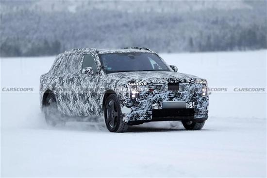 劳斯莱斯一款全新SUV车型的测试谍照于近日曝光,新车在斯堪的纳维亚半岛进行极寒天气测试时被拍到,外观造型相比目前的劳斯莱斯旗下SUV的设计有很大变化。先来看外观,新车前脸采用分体式灯组设计,格栅宽度较现款车型有所增加,同时车头下方配备进气口,该进气口造型与品牌首款纯电车型闪灵保持一致。