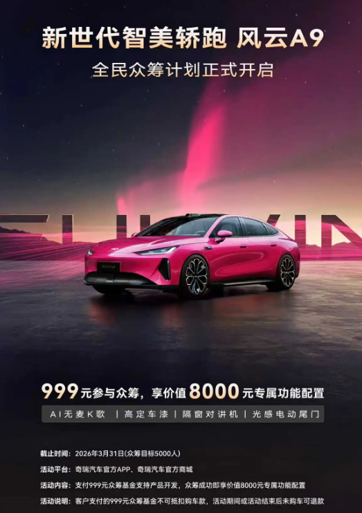 近日,奇瑞风云A9产品配置正式曝光。消费者支付999元参与众筹,若众筹成功(目标5000人),即可解锁价值8000元的专属功能配置,涵盖AI无麦K歌、高定车漆、隔窗对讲机及光感电动尾门,活动截止至2026年3月31日,未购车可退款,资金不可抵扣车款。