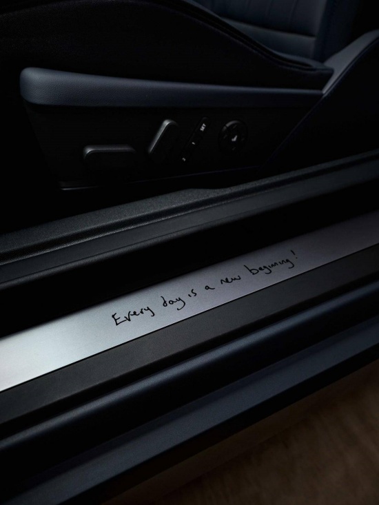 内饰方面,新车也进行了特殊设计,方向盘采用10色编织彩条绑带,仪表台以环保材料立体编织出暗调条纹织物,座椅则通过龙葵蓝撞色与签名刺绣强化设计感。另外,新车中央OLED圆屏新增三种Paul Smith专属动态背景,包括色彩渐变条纹与手绘图案,支持触控与手势操作。此外,车门开启时地面会投射出设计师手写体“Hello”灯光投影,搭配迎宾踏板上的“Every day is a new beginning(每天都是全新的开始)”字样,仪式感满满。
