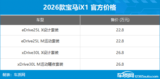 2026年1月21日,宝马官方宣布旗下紧凑型纯电SUV——2026款宝马iX1正式上市,共推出4款配置车型,官方指导售价区间为22.80-26.80万元。
