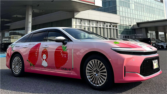 日本栃木丰田汽车经销商为庆祝其成立80周年,推出了一款全球独一无二的“草莓皇冠”(IchigoCrown)车型。外观方面,该车前脸配备大尺寸黑色直瀑式格栅,格栅上方搭载狭长的贯穿式大灯,车身以粉色为基底,搭配柔和的白色渐变设计,侧面绘制有 “Tochiotome”“Tochiaika”“Skyberry” 等当地知名草莓品种图案。