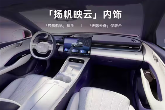 内饰设计紧跟主流新能源车风格,配备内嵌式液晶仪表和大尺寸悬浮式中控屏,横贯整个中控台的空调出风口有效拉宽车内宽度。配置层面,新车将搭载AI灵犀智舱系统,搭载基于联发科3纳米工艺打造的8678座舱芯片、23扬声器AI伯牙之音音响、座椅加热/通风、手机无线充电等功能。