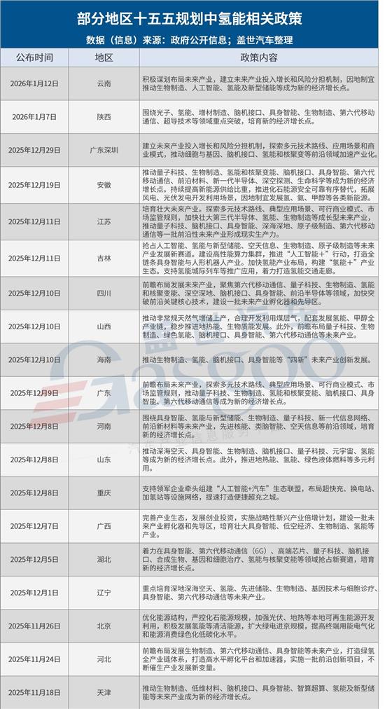 当前,氢能作为清洁能源领域的核心赛道之一,正迎来全球范围内的加速发展新阶段。中国已明确将氢能上升至国家能源战略高度,将其列为战略性新兴产业与未来产业的重点发展方向。随着全国各省市 “十五五” 规划密集落地,据盖世汽车不完全统计,氢能已被近20个地区纳入发展蓝图。