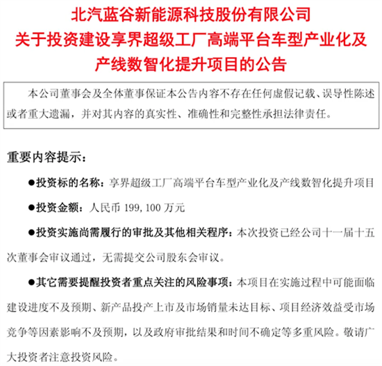 公告内容显示,为持续提升品牌价值,增强企业竞争力,满足子公司北京新能源汽车股份有限公司基于整体发展战略制定的产品规划,北汽新能源拟投资建设享界超级工厂高端平台车型产业化及产线数智化提升项目。
