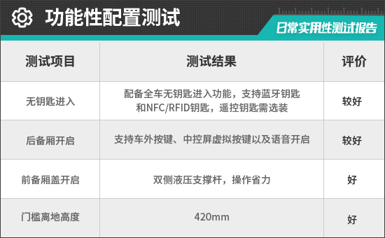评测车的后备厢支持车外按键、中控屏虚拟按键以及语音开启,并支持电动后备厢位置记忆功能,使用便利性表现不错。