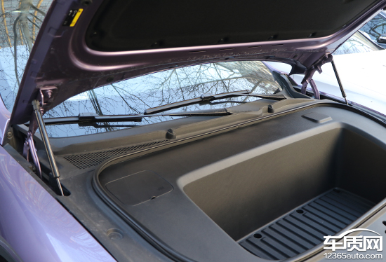 前备厢盖的开启开关位置位于驾驶位前部左下方,开启时需要拉动车内开关两次,然后直接抬起前备厢盖即可。评测车的前备厢盖采用双侧液压杆支撑,稳定性出色,开启和关闭都比较轻松省力。